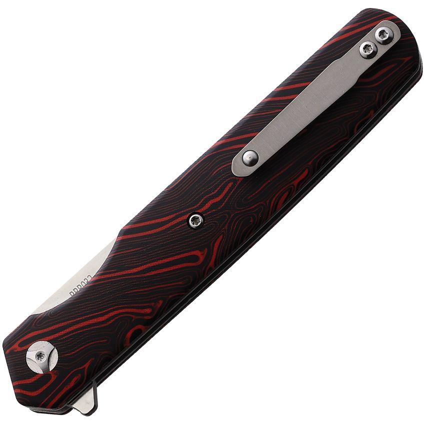 Assisted opening. 4.5″ (11.43cm) closed. 3.5″ (8.89cm) satin finish D2 tool steel tanto blade. Black and red G10 handle. Extended tang. Pocket clip. Boxed.